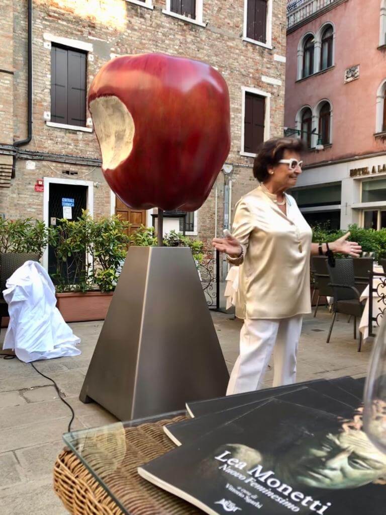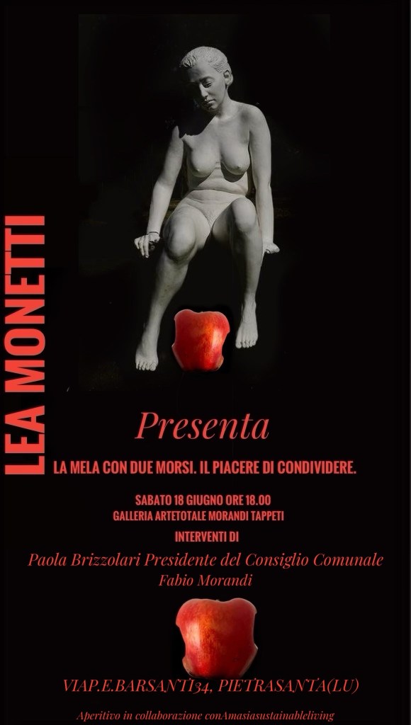 La mela con due morsi. La mela che libera dal peccato dell’essere umano e lo gratifica della sua presa di coscienza, la consapevolezza di essere energia e talento che finalmente sono liberate per manifestarsi nel piacere della condivisione. Lea Monetti, con la sua mela, è voluta entrare direttamente nel presente/futuro, non più la rappresentazione di un consumo unilaterale ma il simbolo di una condivisione e di un nuovo equilibrio. La condivisione che unisce e non divide le Arti, la condivisione di mordere la stessa conoscenza universale che unisce le culture del mondo. E se la mela al suo primo morso “cacciò ” l”essere umano dalla natura e, lo fece entrare in una “realtà artificiale” e individualista, oggi la stessa natura si sta divorando con ingordigia la mela. Lea Monetti con la creazione della mela a due morsi, ci riconnette alla totalità della natura, alla condivisione, alla risonanza dell’intera umanità divenendo simbolo di un proposito aperto al futuro del mondo