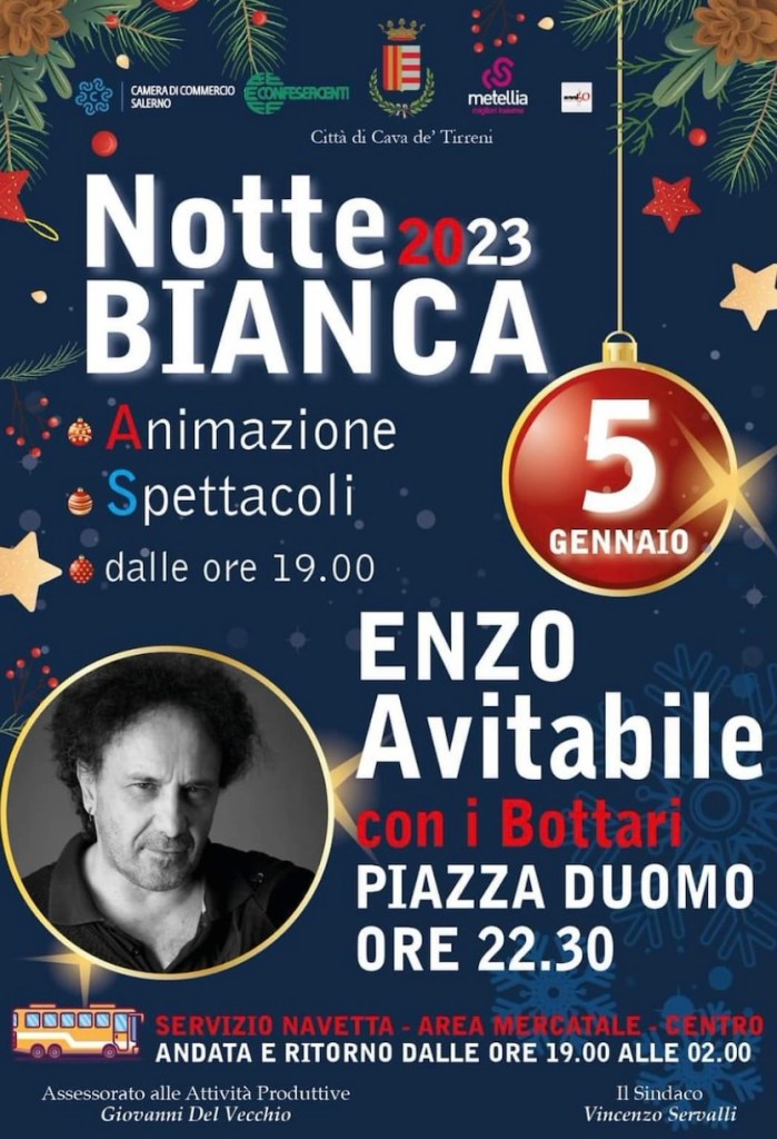 Il 5 gennaio 2023 sarà l’anno della ripresa, con la diciottesima edizione; un grande artista partenopeo e internazionale come Enzo Avitabile salirà sul palco in piazza Vittorio Emanuele III alle 22.30 con i suoi Bottari, non mancheranno gli artisti da strada, i momenti dedicati ai più piccoli con “Aspettando la Befana” che avrà inizio alle ore 19, lungo il centro storico. Il 6 gennaio inizierà sulle note di un altro napoletano, vincitore di “Sanremo Giovani”, Marco Sentieri, chiuderà la “Notte Bianca 2023”, il deejay Marco Montefusco. A condurre la serata sul palco in piazza il duo collaudato di presentatori, Manuela Pannullo e Alfonso Senatore.
