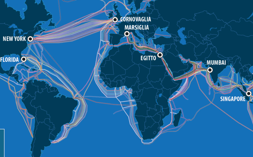 La rete globale dei cavi sottomarini sono la gran parte della spina dorsale di Internet, sono loro a veicolare i dati di tutto il mondo che si collegano alle reti che alimentano le torri cellulari e le connessioni Wi-Fi; per fare un esempio i cavi sottomarini collegano la tecnologia da New York a Londra all’Australia e Los Angeles. Nonostante molte persone possano pensare che internet “viaggi con i satelliti”, il 98% delle telecomunicazioni digitali viaggia attraverso le dorsali marine. Nel 2023 ci sono state un trilione di transazioni realizzate attraverso cavi sottomarini con un valore stimato di 10 trilioni di dollari ed un tasso di crescita annuale pari al 12% secondo i dati della società di ricerca, marketing e consulenza TeleGeography di Washington. Non dimentichiamo che oltre le telecomunicazioni vi sono le piattaforme estrattive di materie prime e le condotte subacquee quali oleogaasdotti, giacimenti e realizzazioni di impianti di depurazione.