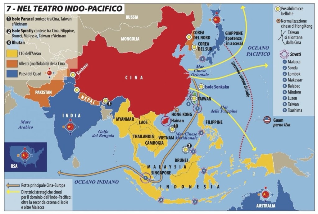 Lo Stretto di Malacca, nel Mar Cinese Meridionale, rappresenta virtualmente il punto di congiunzione tra l’Oceano Indiano e l’Oceano Pacifico, attraverso il quale transita più del 90 % delle risorse energetiche quali il petrolio che, dal Medioriente si dirige principalmente verso la Cina, il Giappone la Corea del sud e i paesi dell’Unione Europea. Nonostante che la riconfigurazione geopolitica dell’Asia nell’ “Indo-Pacifico” sia concettualmente e giustamente attribuita al Giappone, il termine è stato inizialmente introdotto nei discorsi politici nel 2010 dall’allora Segretaria di Stato Hillary Clinton, per poi essere incorporato nel White Defence Paper australiano nel 2013, nella politica estera giapponese e americana rispettivamente nel 2016 e 2017, nell’approccio regionale dell’ASEAN nel 2018, e dai paesi europei, Francia, Germania e Paesi Bassi, tra il 2018 e il 2020. Il 15 settembre del 2021 si formò’ l’Aukus il patto trilaterale tra Regno Unito, Australia e America che nell’aprile del 2024 ha aperto le sue porte al Giappone rendendolo nuovamente parte attiva e geostrategica dell’Indo -Pacifico.