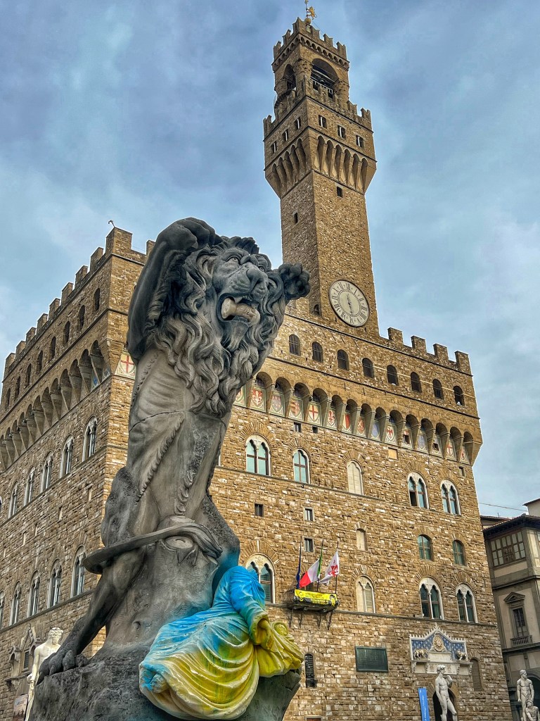 Dove l’Arte si vuole “cancellare” per la sua provenienza geografica, dove si vuole creare il buco della memoria, l’artista Francesco Vezzoli ha voluto creare, direttamente sul posto, l’assemblaggio di un’Opera intitolata Pietà. Un leone novecentesco, allto cinque metri, trovato nel parco di una Villa e messo davanti al Palazzo della Signoria per rinfrescarci la memoria. Il leone, simbolo di Firenze è conosciuto come il Marzocco, dal latino “martius” = di Marte. Un’altra delle spiegazioni avanzate è che marzocco sia la contrazione della parola Martocus, cioè piccolo Marte. Dante riporta la comune credenza che la città di Firenze fosse anticamente dedicata a Marte, e che esistesse una statua romana del Dio. Successivamente collocata alla fine del Ponte Vecchio e travolta dalla grande piena d’Arno del 4 novembre 1333 … eh si proprio il 4 novembre. Successivamente Nel Trecento, almeno fino alla peste nera, accanto a Palazzo Vecchio, sul lato di via della Ninna, la Signoria manteneva un vero e proprio serraglio di leoni, con una trentina di animali, tanto che la strada si chiamava “via dei Leoni”. La decisione di tenere leoni vivi in un serraglio, fu presa per rendere onore a Guglielmo, fratello del Re di ScoziaMalcolm IV, al quale successe nel 1165. Guglielmo, detto Il Leone, perché aveva raffigurato questo animale nello stemma, e aveva fatto un buon governo per Firenze. Questo fu il modo per la città di dimostrargli la loro riconoscenza. La scultura di Francesco Vezzali tiene tra le fauci una testa romana, reperto del II secolo, a significare un frammento di una civiltà perduta. Guardando la statua mi viene alla mente la lettera del grande Raffaello Sanzio a Leone X, un documento del 1519, scritto dal pittore insieme a Baldassarre Castiglione sotto la supervisione di Angelo Colocci, segretario apostolico del Papa. Il tema trattava della mancata protezione e conservazione delle vestigia della Roma Antica. PIETÀ per l’Arte antica.
